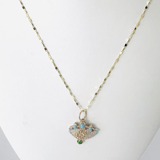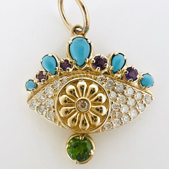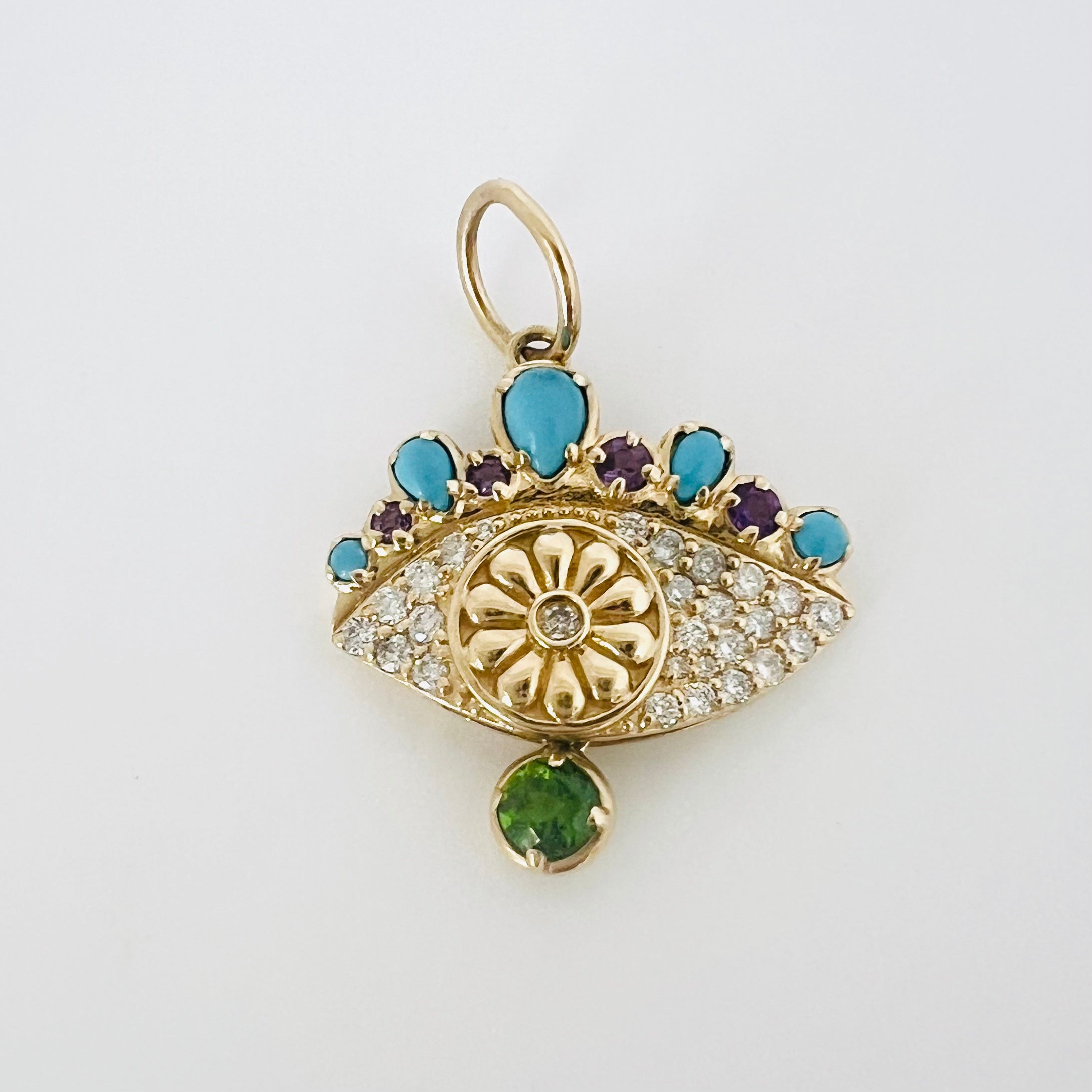 14 k gold with diamond, emerald, amethyst and turquoise evil eye pendant