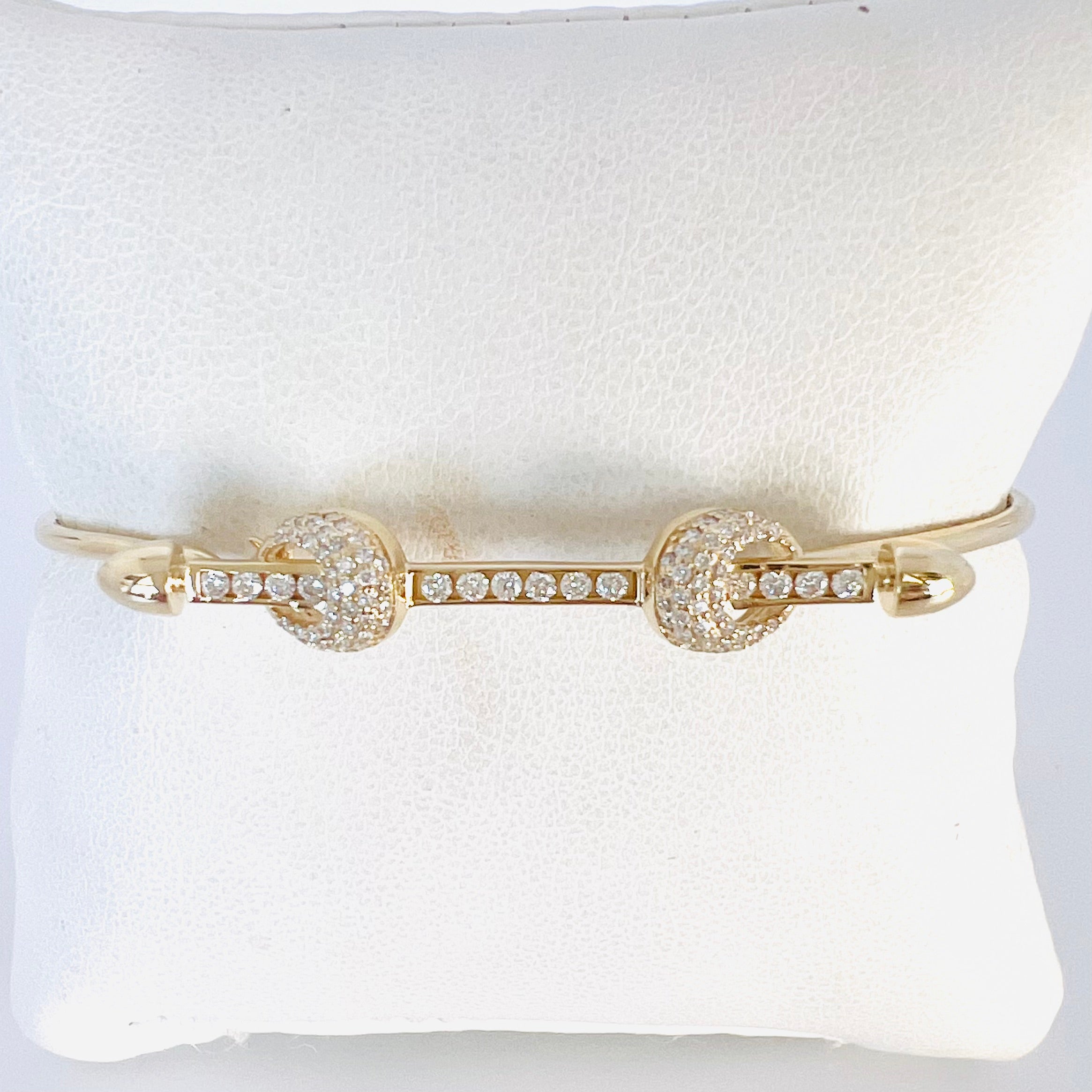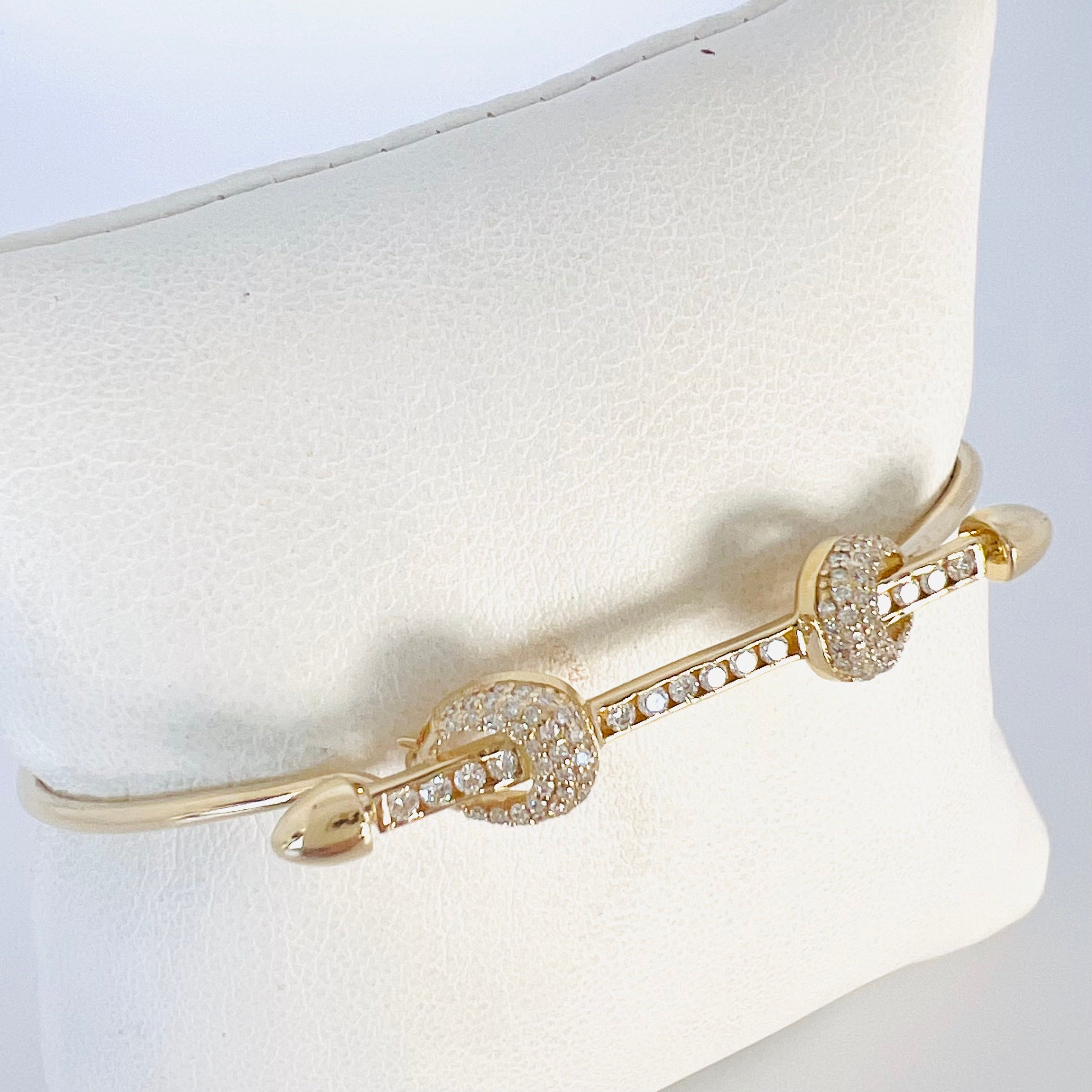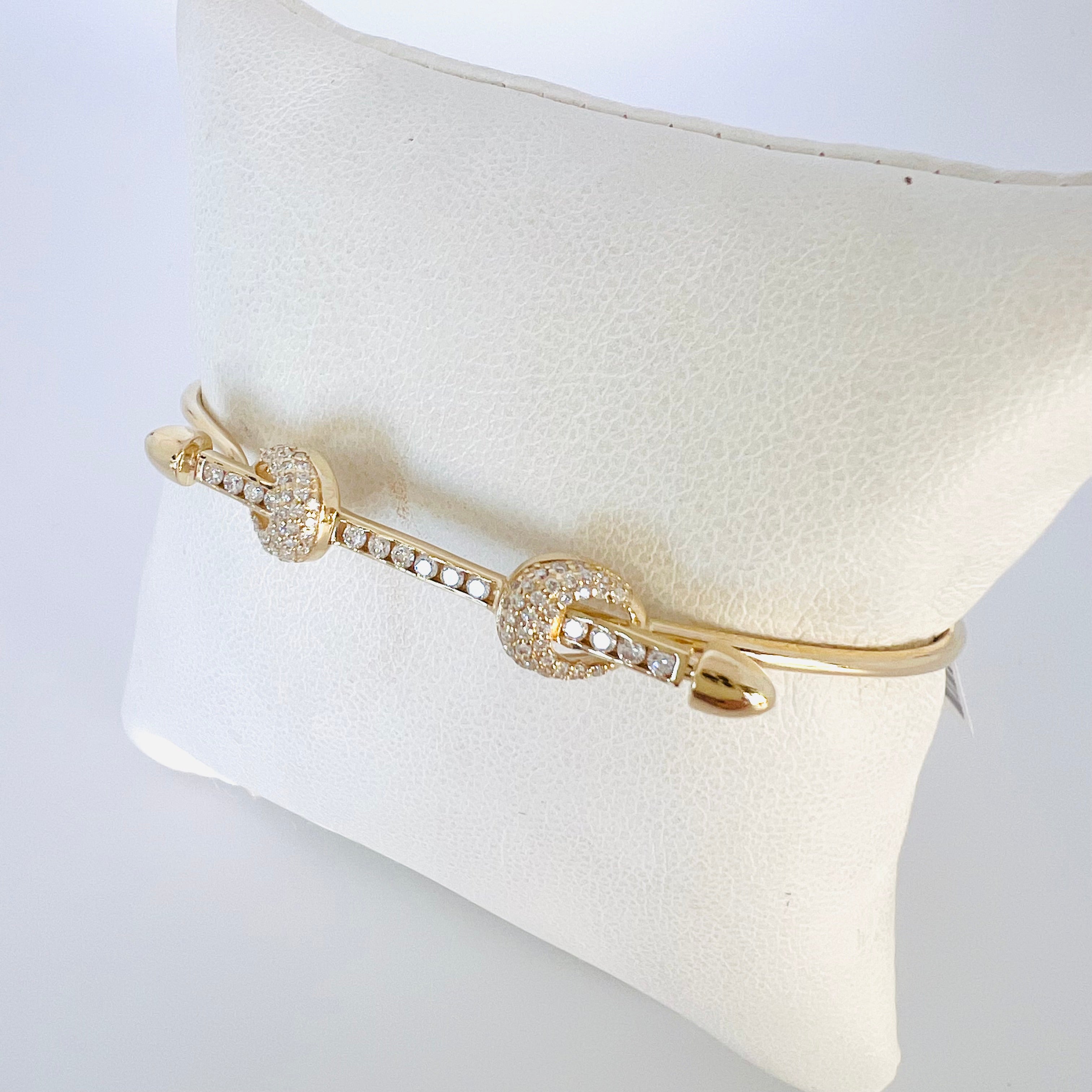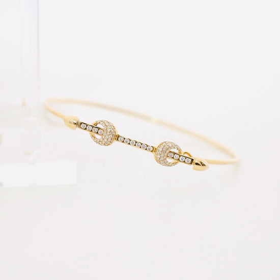 14k gold diamond bar wire bangle bracelet with two diamond knots