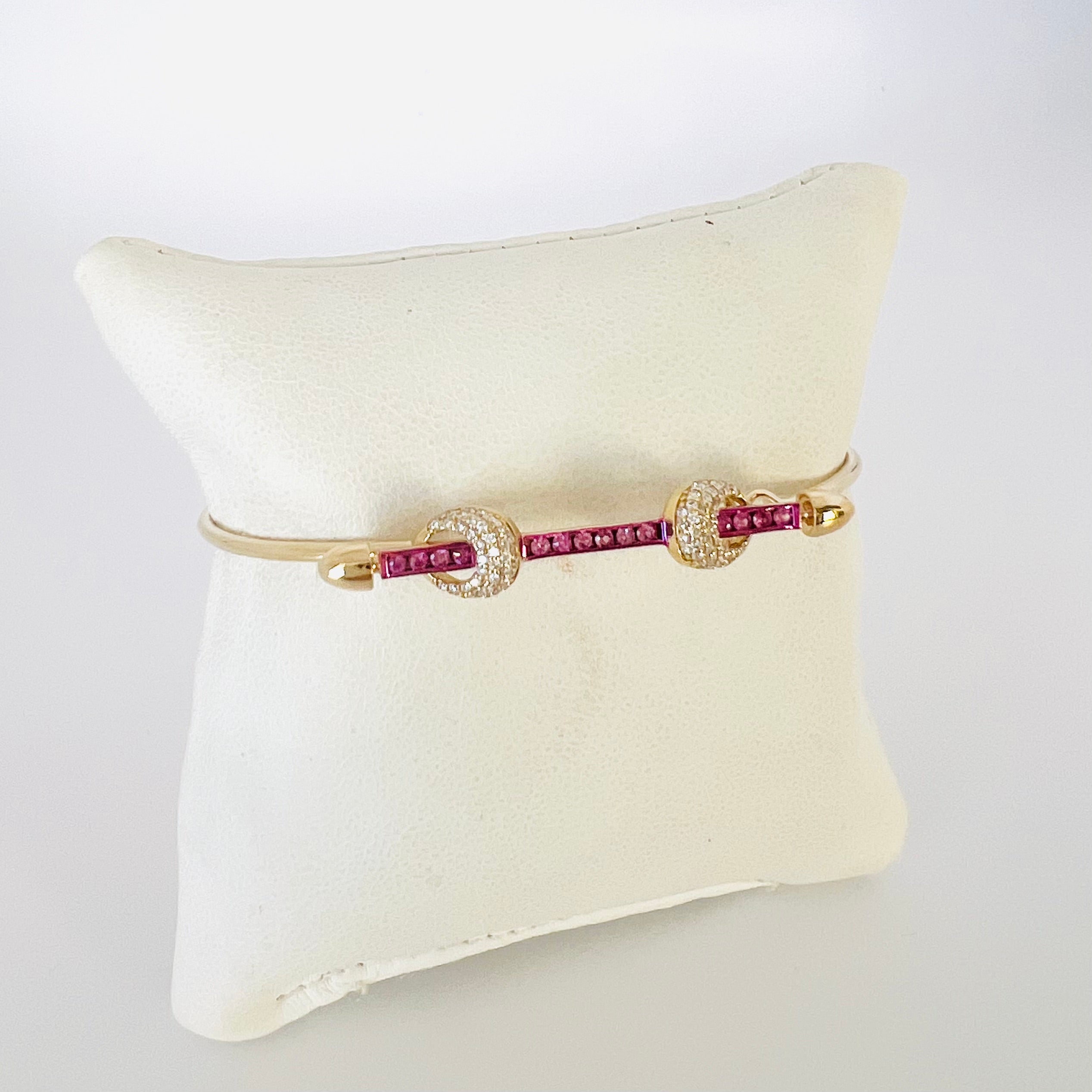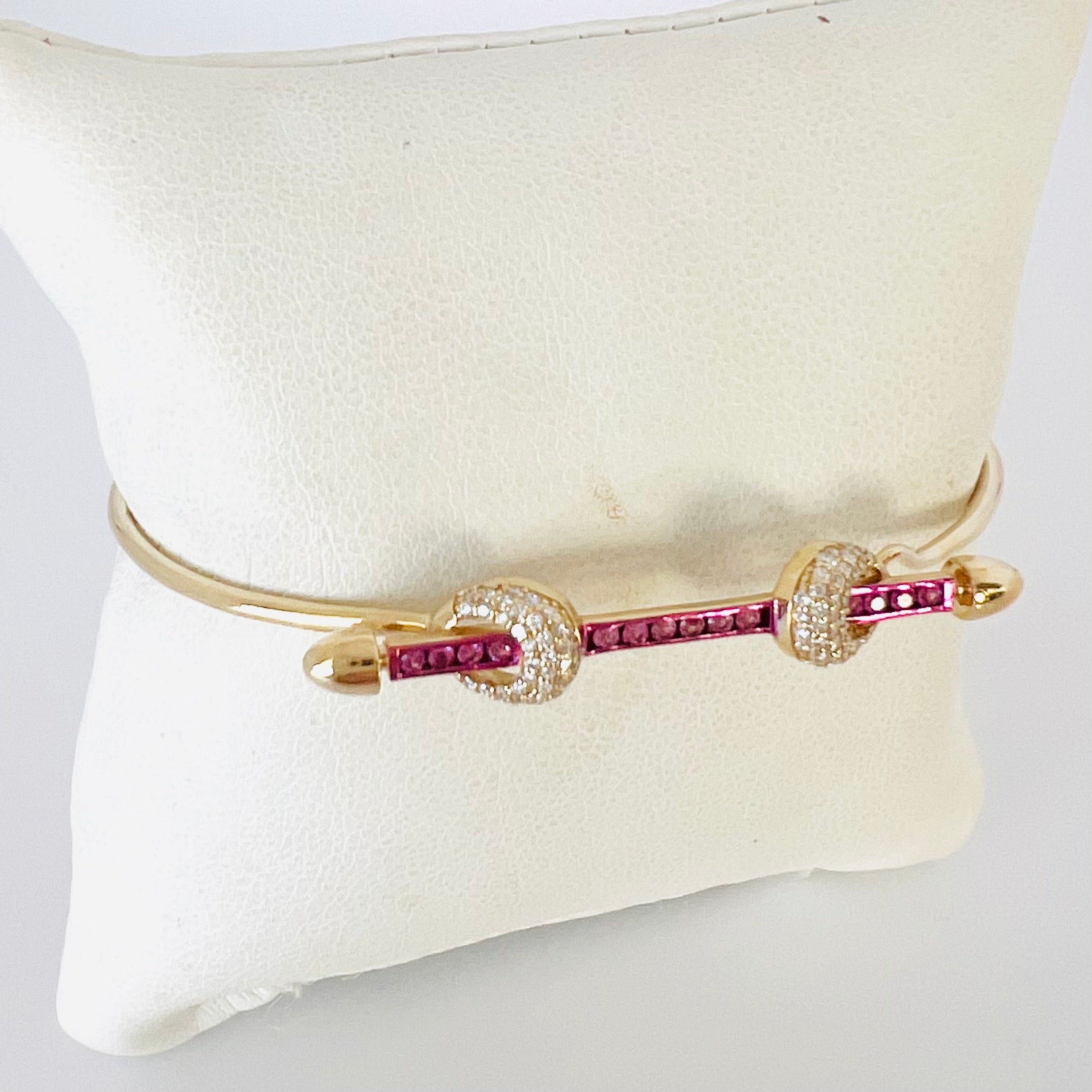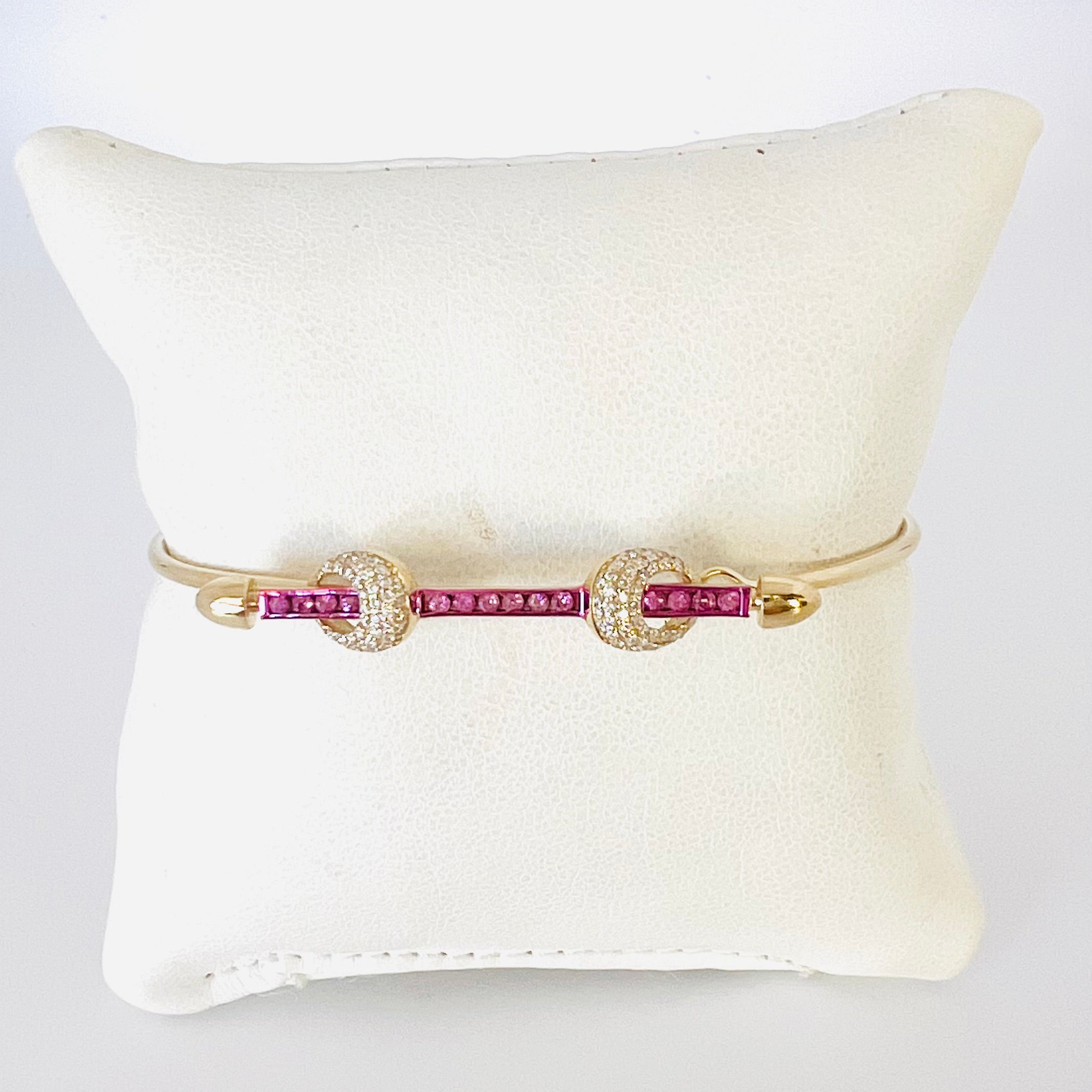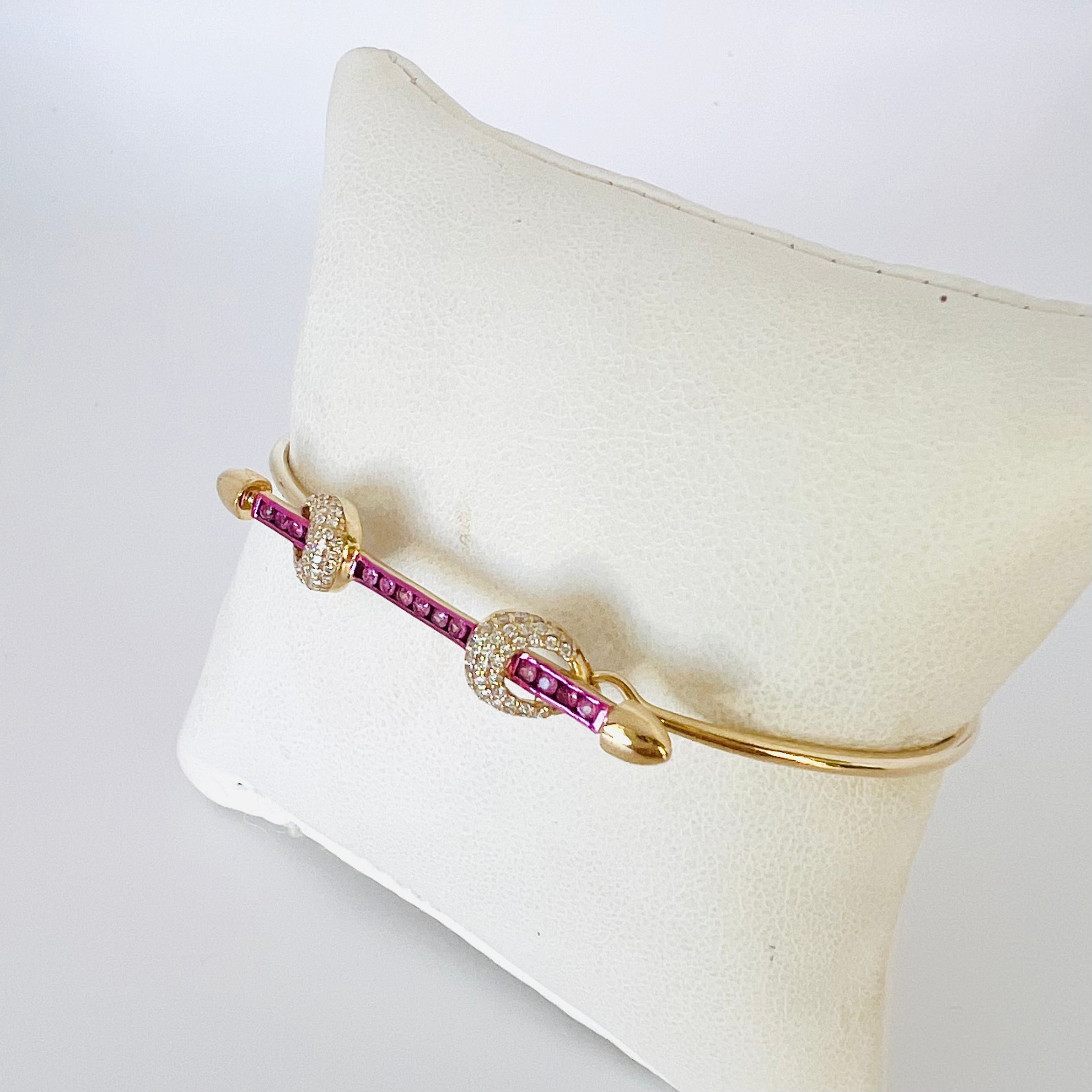 - 14k gold bangle bracelet with pink sapphire bar and diamond knots