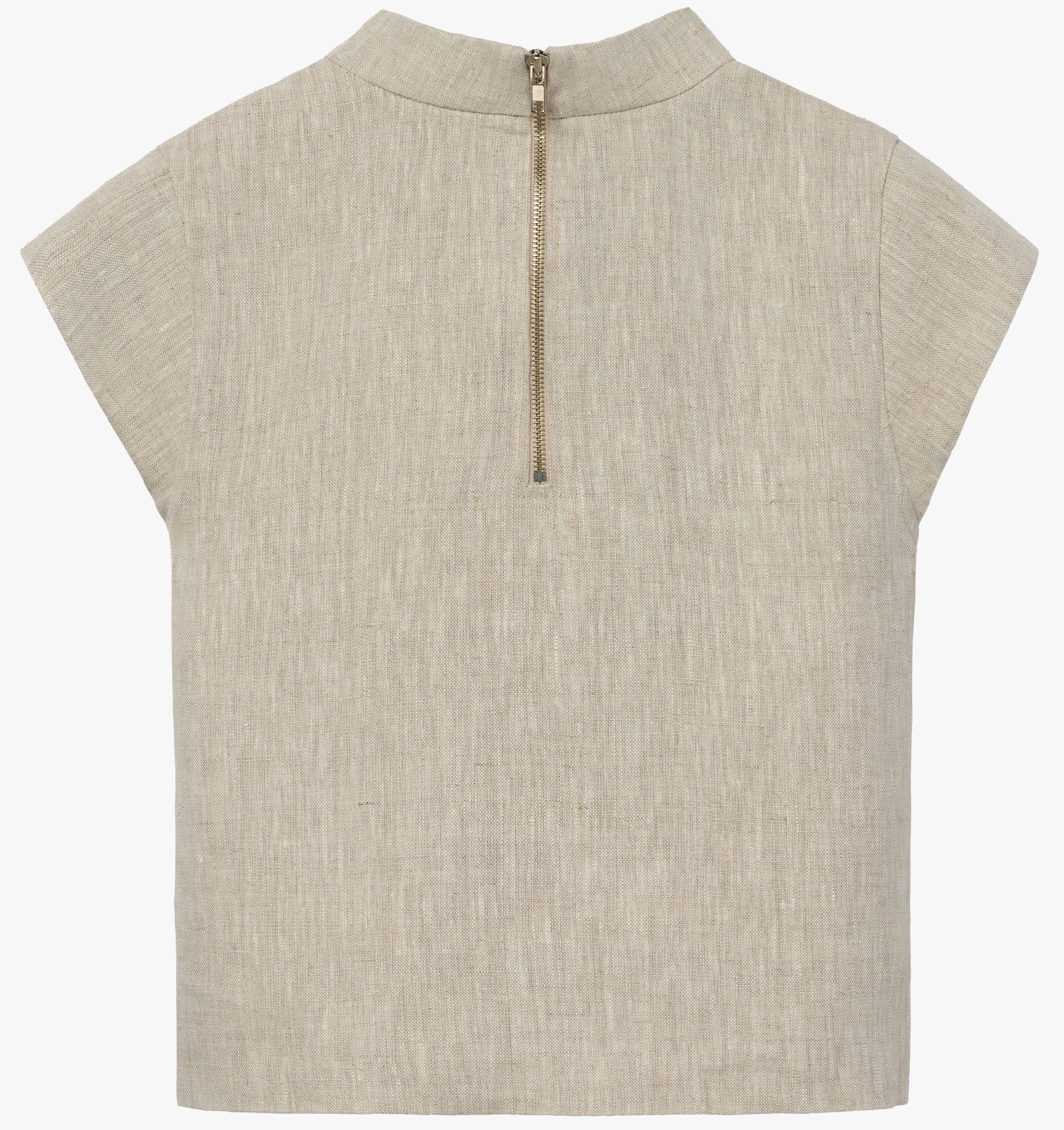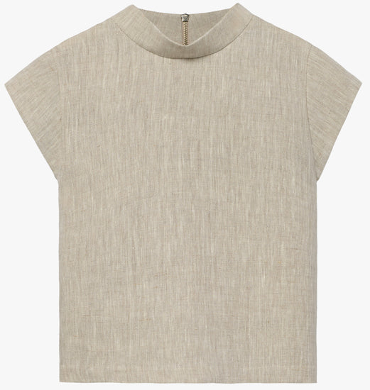 The Audrey Top is a modern wardrobe essential with timeless versatility. Designed with a sleek mock turtleneck and subtle cap sleeves, it offers a clean, minimalist silhouette. The lightly cropped, straight-cut body makes it perfect for pairing with high-waist trousers or skirts. A reversible zipper detail allows the piece to be worn with the closure in front or back—effortlessly shifting from sophisticated to edge-forward styling.