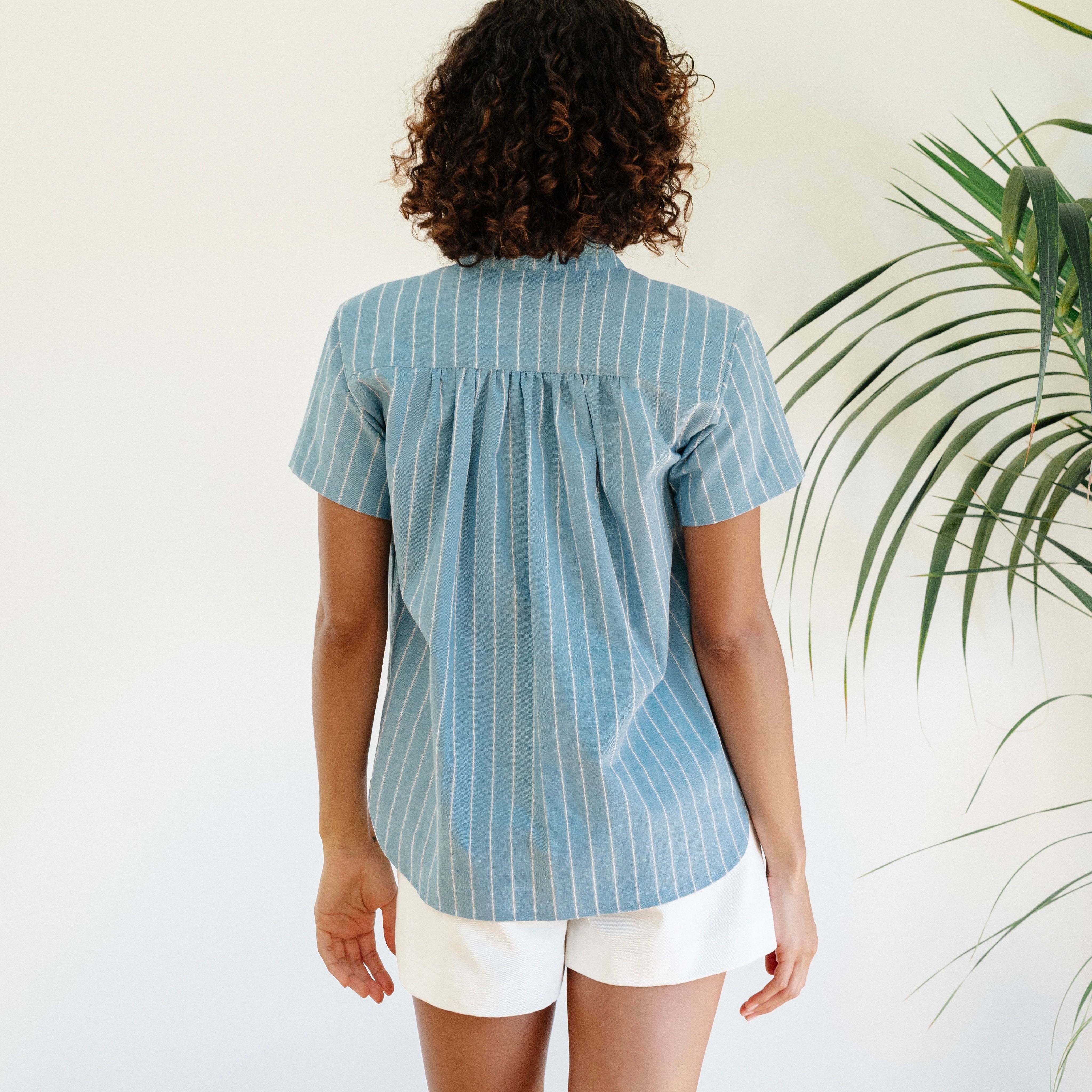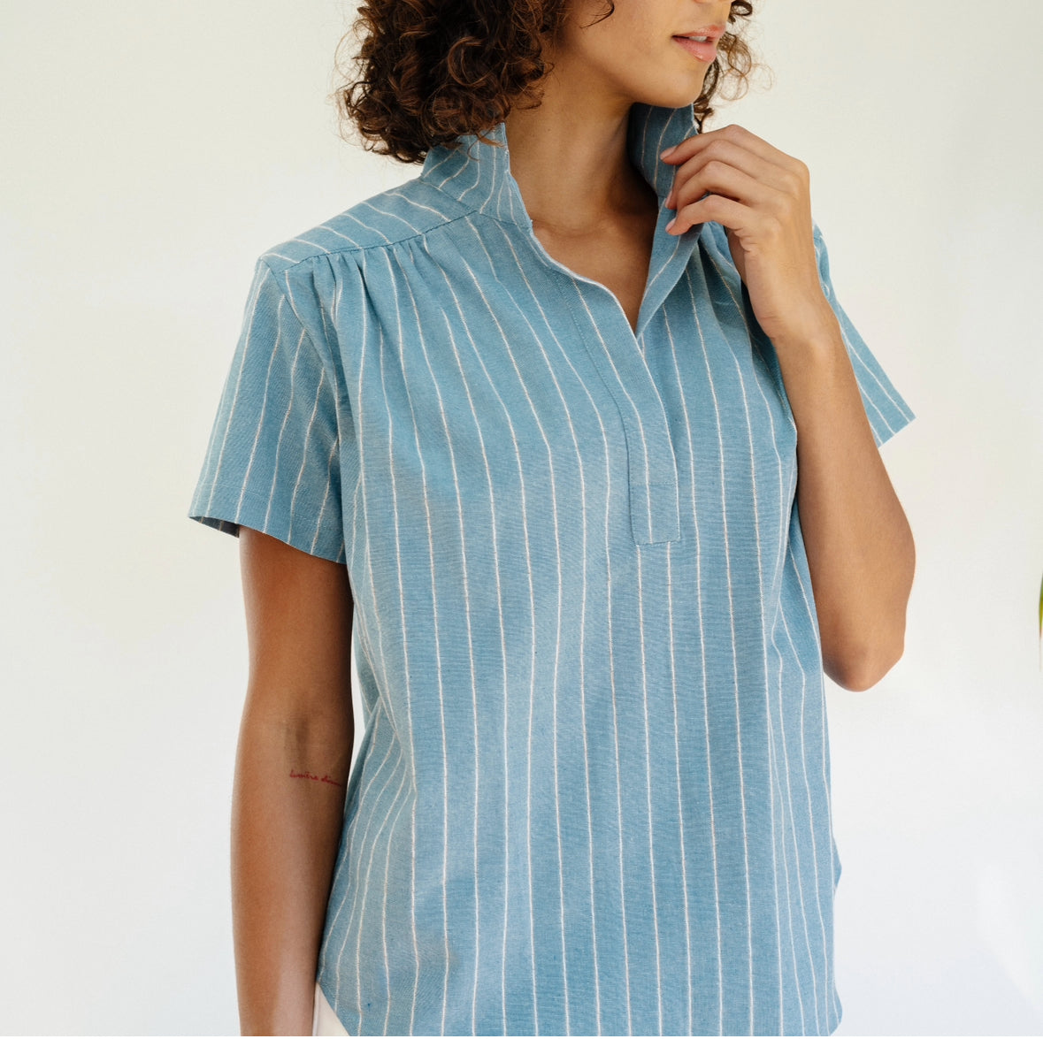 The ADDIE top is feminine and sophisticated. She's a pull over with a structured collar to be worn up or down. Her gathering across the chest and back give a flowy, easy to wear top. Complete with our signature v-neckline, she will be one of your favorites!
