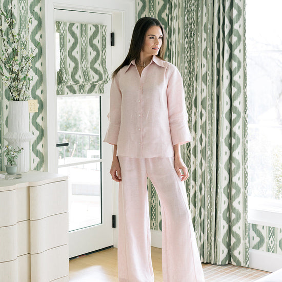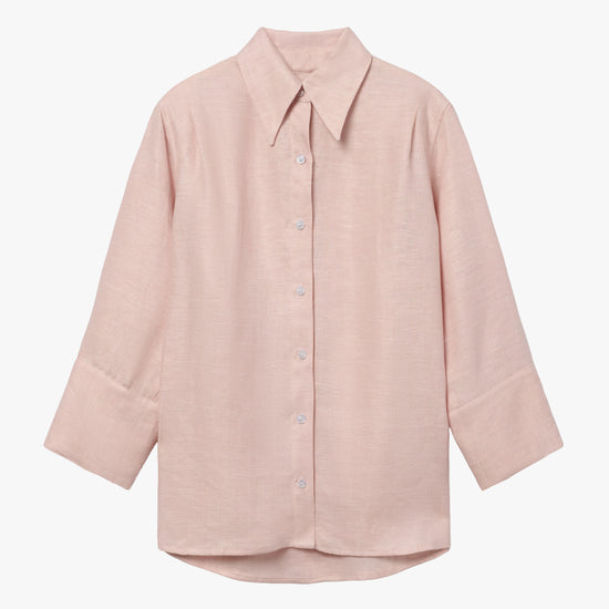The HATTIE top is a modern button-down designed to elevate the everyday. Structured pleats at the shoulders create subtle lift and dimension, adding shape and quiet confidence. The 3/4-length sleeves are finished with oversized cuffs for a bold, polished touch, while an exaggerated collar frames the neckline with effortless sophistication.