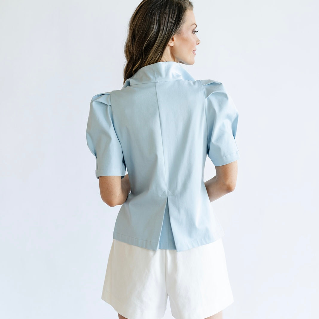 The ADEYLN top is both versatile and classically stylish. She makes a statement with her oversized ruffled collar that can be worn up or down. Adelyn's structured puff sleeve makes her appropriate for a fun night out or a special ladies lunch! To complete a fabulous look, pair the ADELYN top with the Blakely short!