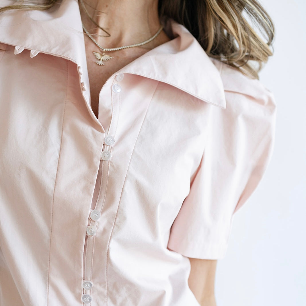 The ADEYLN top is both versatile and classically stylish. She makes a statement with her oversized ruffled collar that can be worn up or down. Adelyn's structured puff sleeve makes her appropriate for a fun night out or a special ladies lunch! To complete a fabulous look, pair the ADELYN top with the Blakely short!