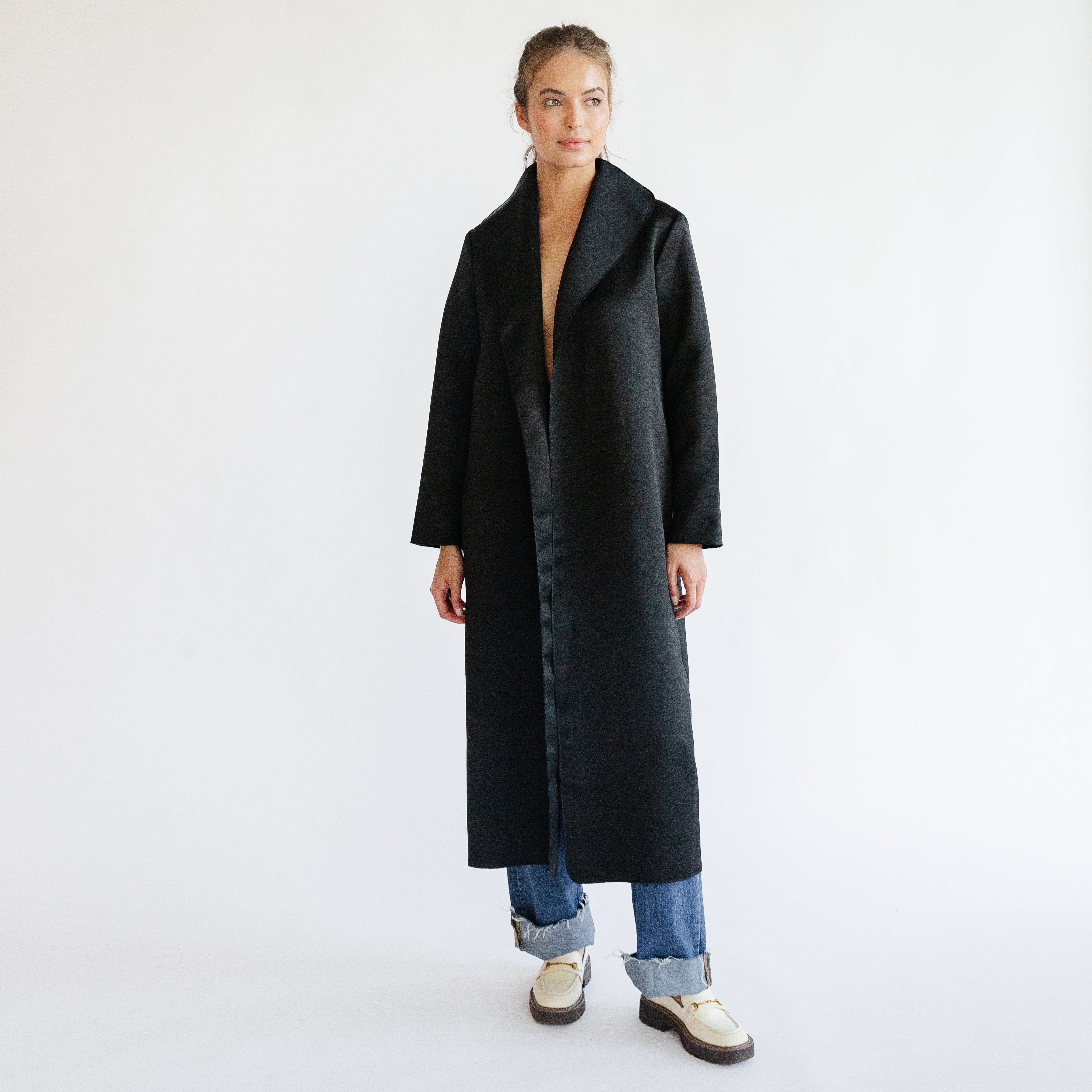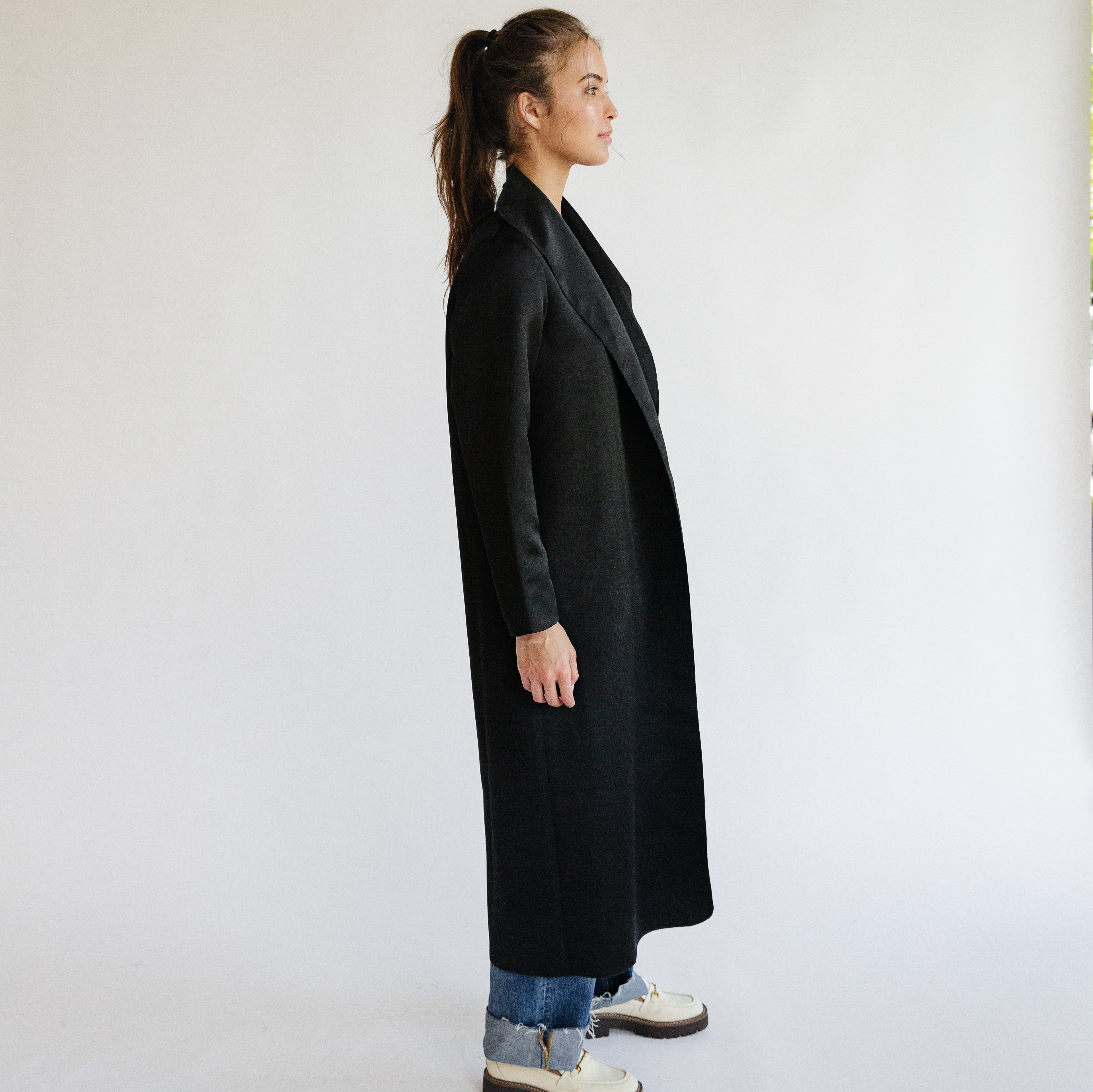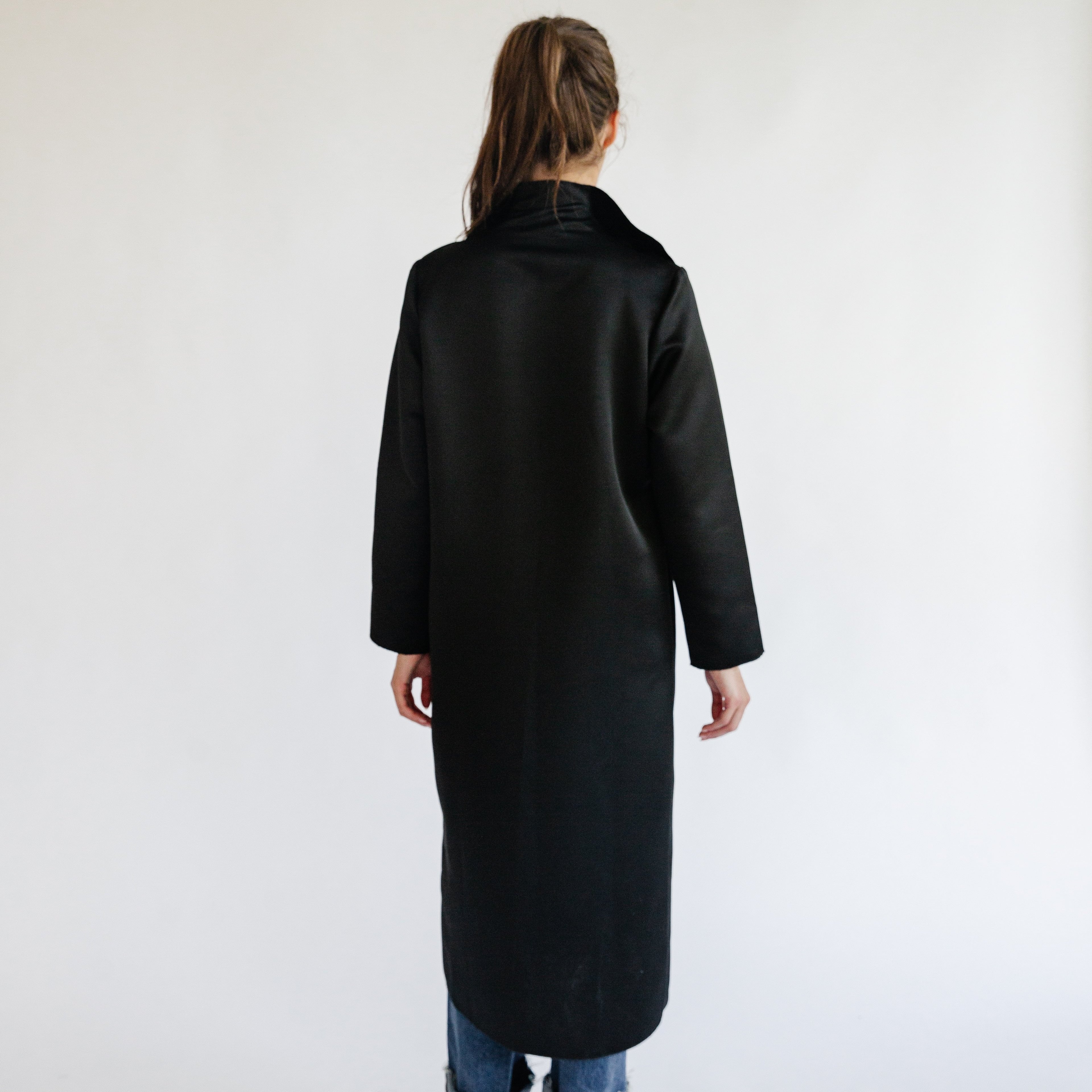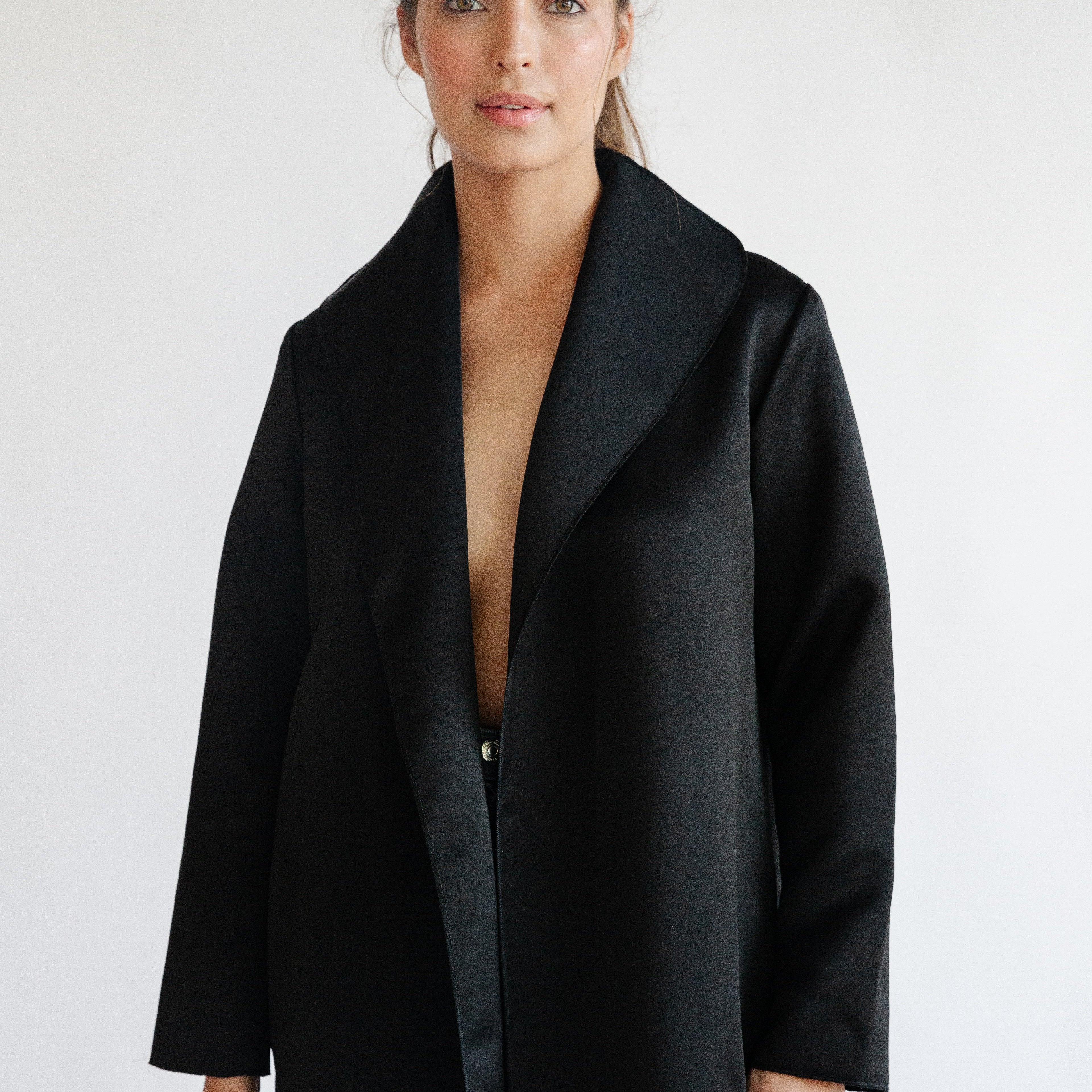the AMANDA coat in black satin