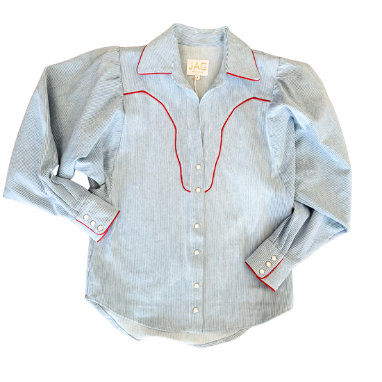 Turn heads with this effortlessly stylish Western-inspired DOLLY top. Designed with a relaxed fit and dramatic bat-wing puff sleeves, this piece blends modern elegance with classic cowgirl charm. Pearl snap buttons add timeless flair, while contrast piping accents the wrist cuffs and front and back yokes for a striking, tailored finish. The soft drape creates a flattering silhouette that’s easy to dress up or down—perfect for rodeo nights, brunch dates, or everyday wear with denim.