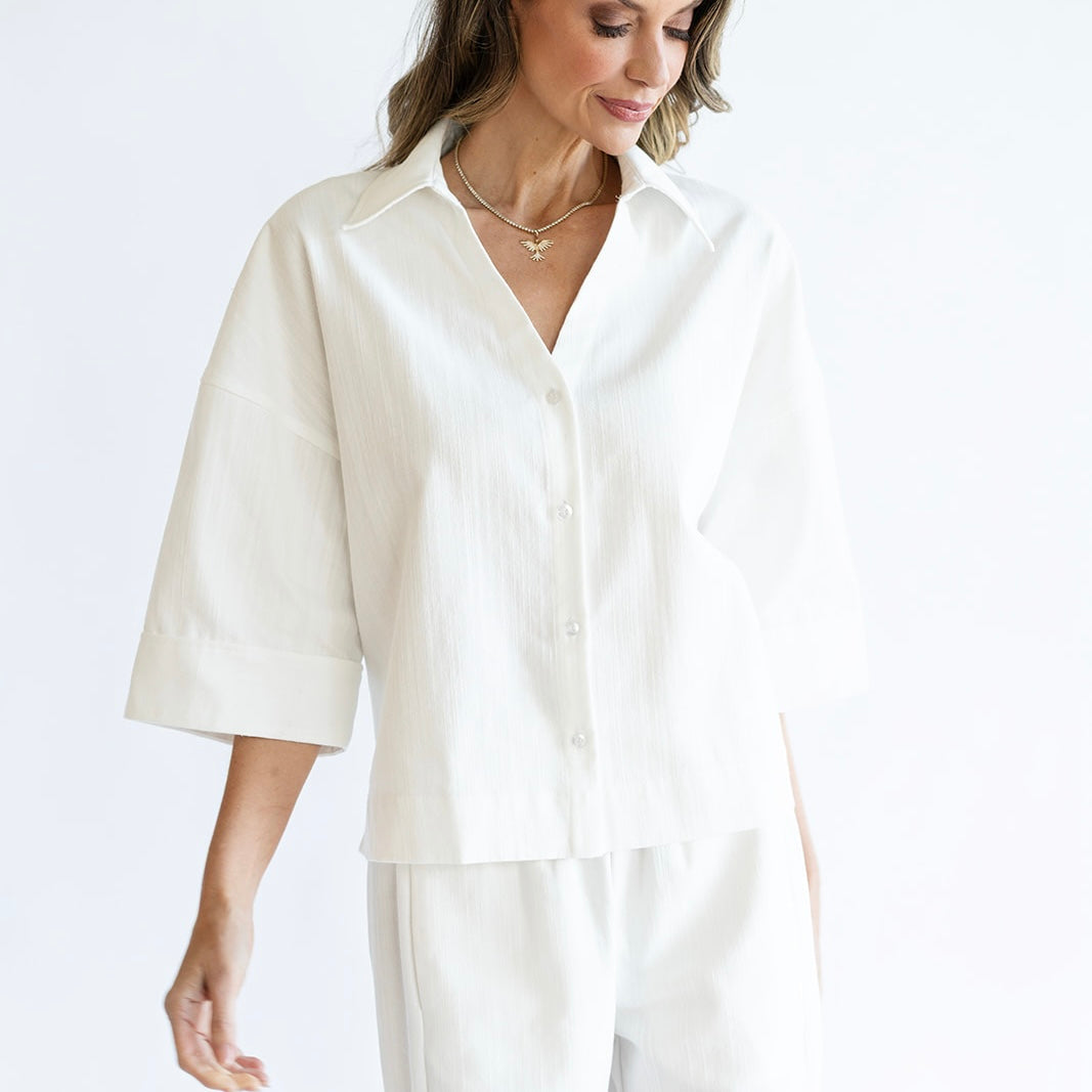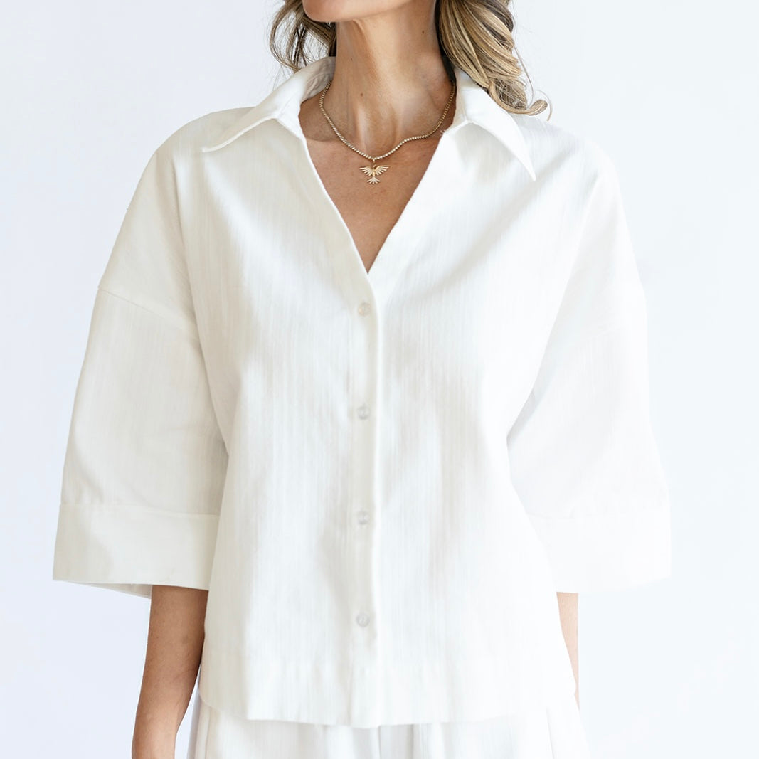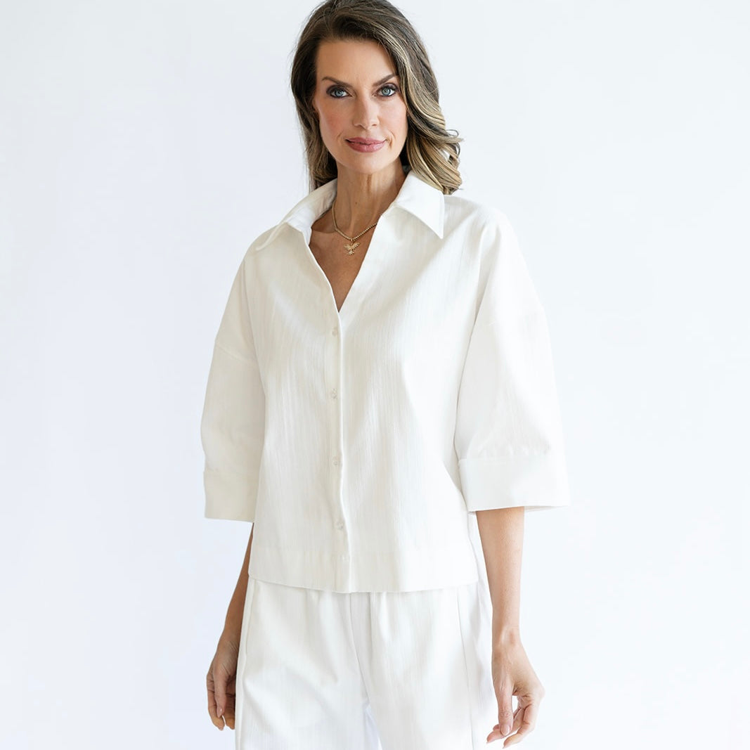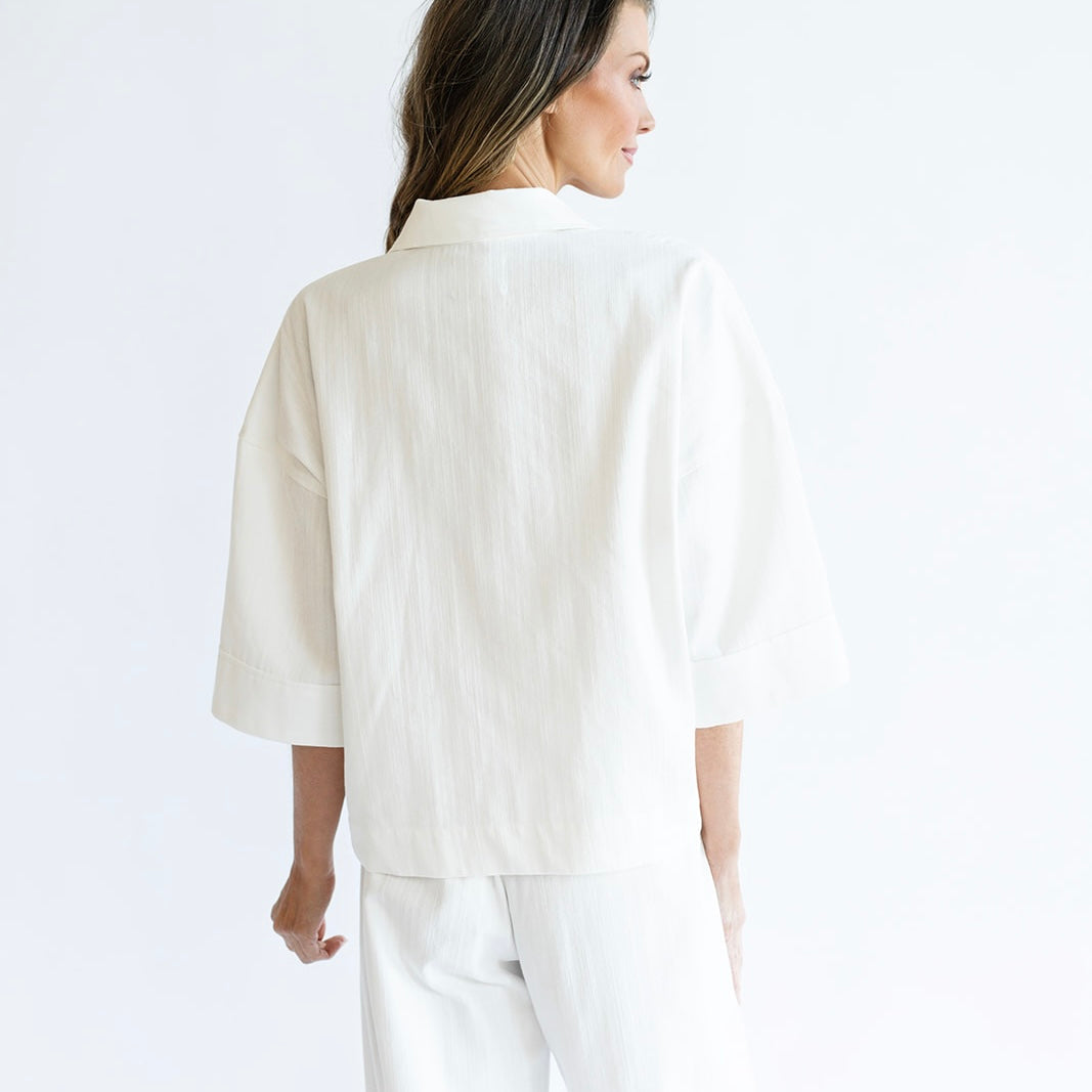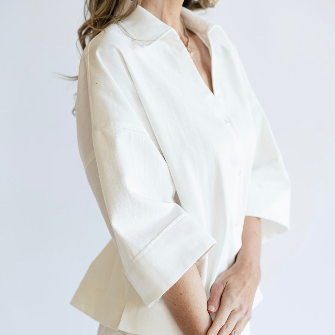 The CANDACE top is a timeless wardrobe staple. Featuring a chic v-neck button down design, she is complemented by a slightly wide spread collar to add a touch of sophistication. Her three-quarter length wide opening sleeve offers a perfect balance between coverage and ease. Versatile and effortlessly chic, the CANDACE top pairs beautifully with the PATTY pant or your favorite casual denim.