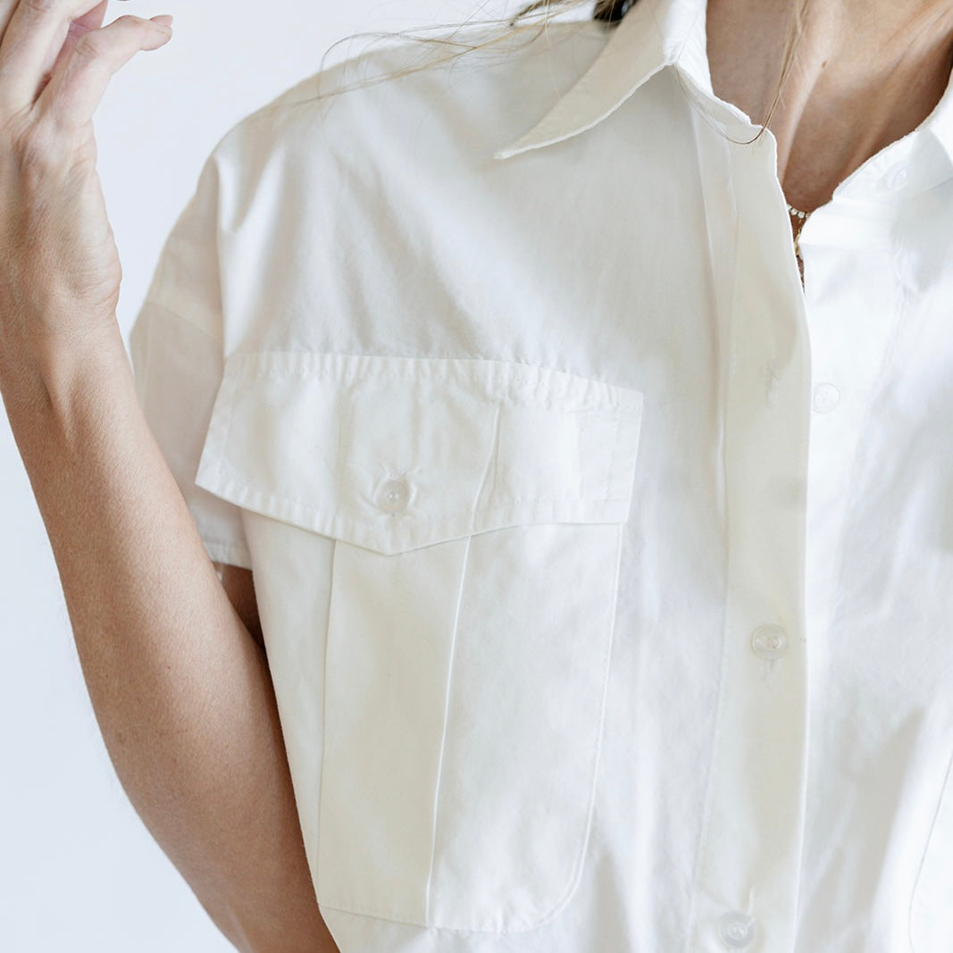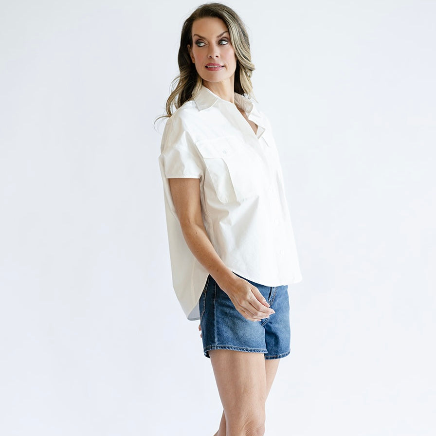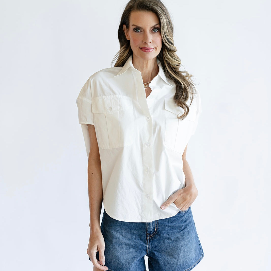 the EVELYN top is your on trend and versatile go-to top. With her drop cap sleeve, classic button down front, and chic front pockets, the EVELYN offers a mix of sophistication and casual charm. Her slight oversize fit ensures comfort while maintaining a trendy look, making her a easy go-to for pairing with denim.