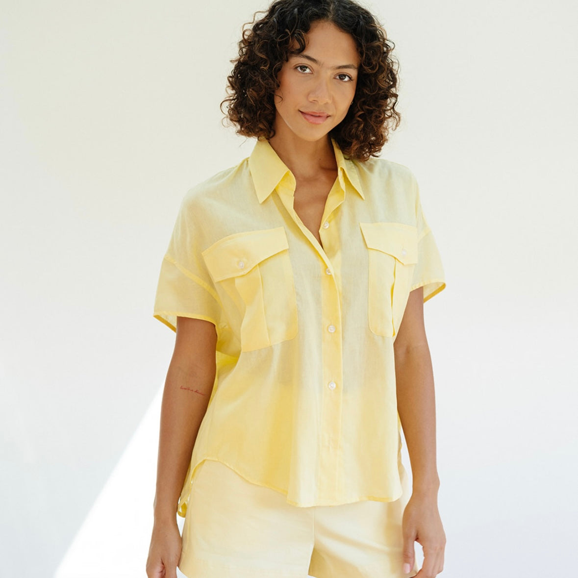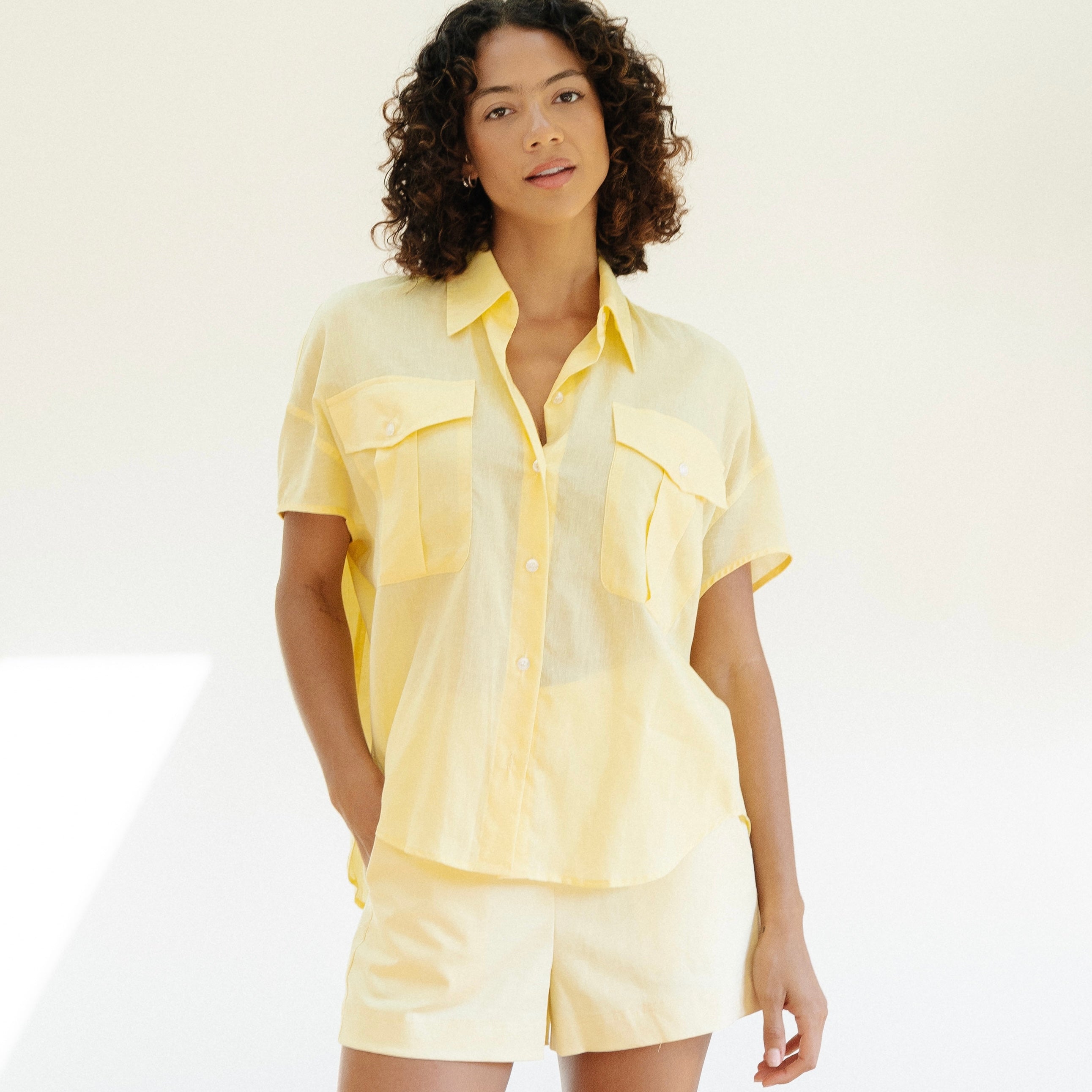 the EVELYN top is a classic and versatile go-to top. With her drop cap sleeve, classic button down front, and chic front pockets, the EVELYN offers a mix of sophistication and casual charm. Her slight oversize fit ensures comfort while maintaining a trendy look, making her an easy go-to for pairing with denim.