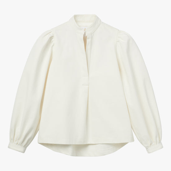 the LAURA is everything in femininity and flattery. the LAURA is slightly structured with a Henley collar and "not too oversized" balloon sleeves. She is finished with a slight high/low design to give little extra coverage from behind but not too much fabric in the front to wear out or tucked in.