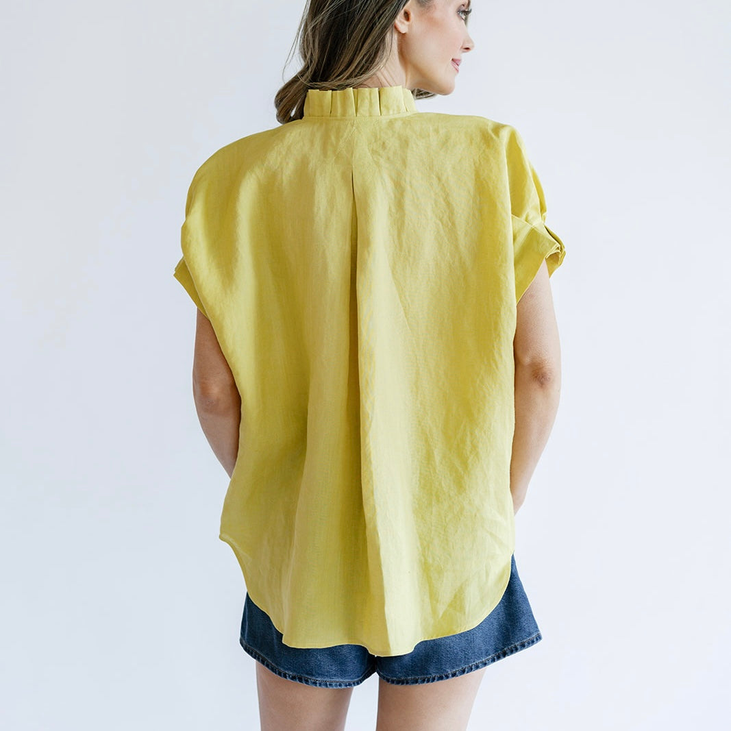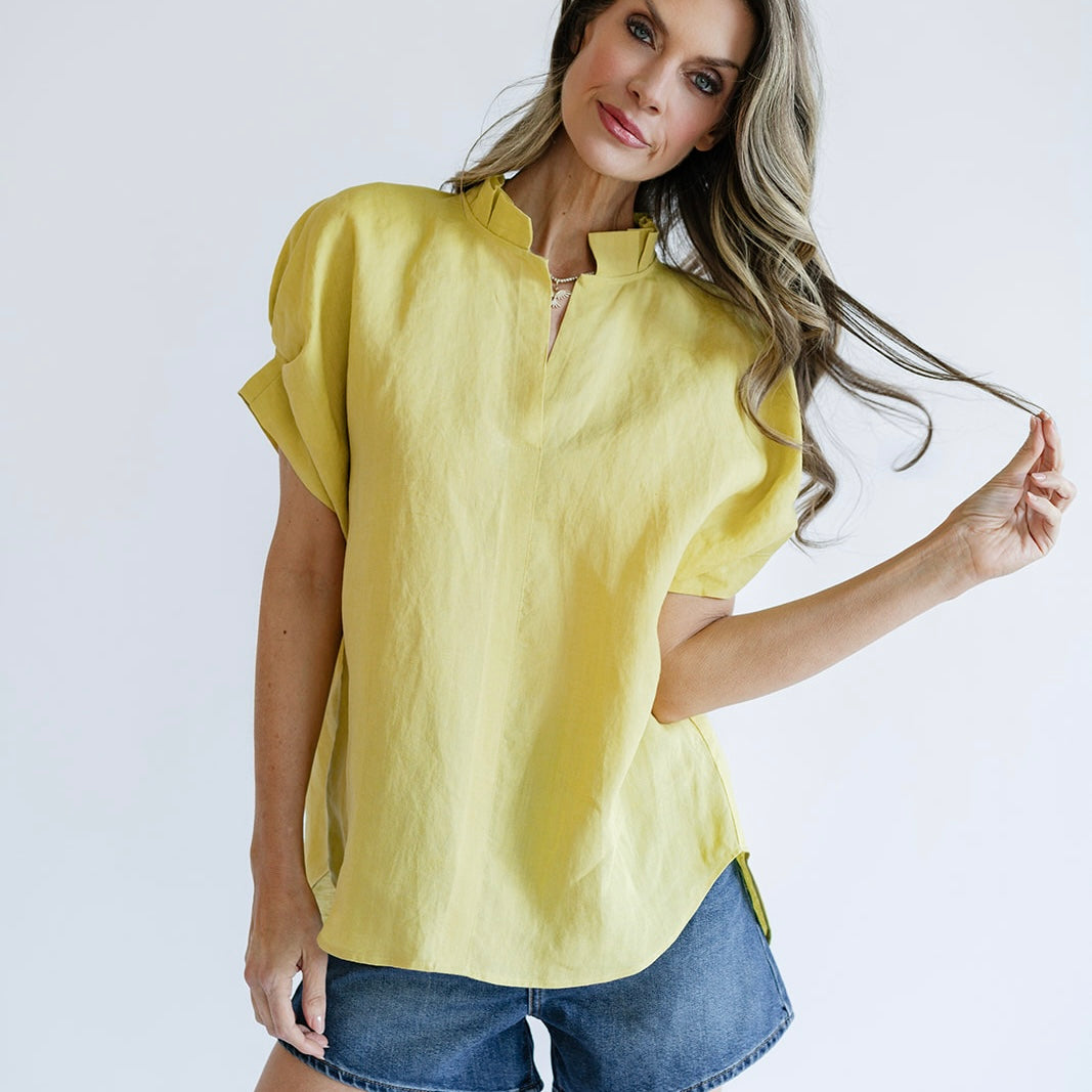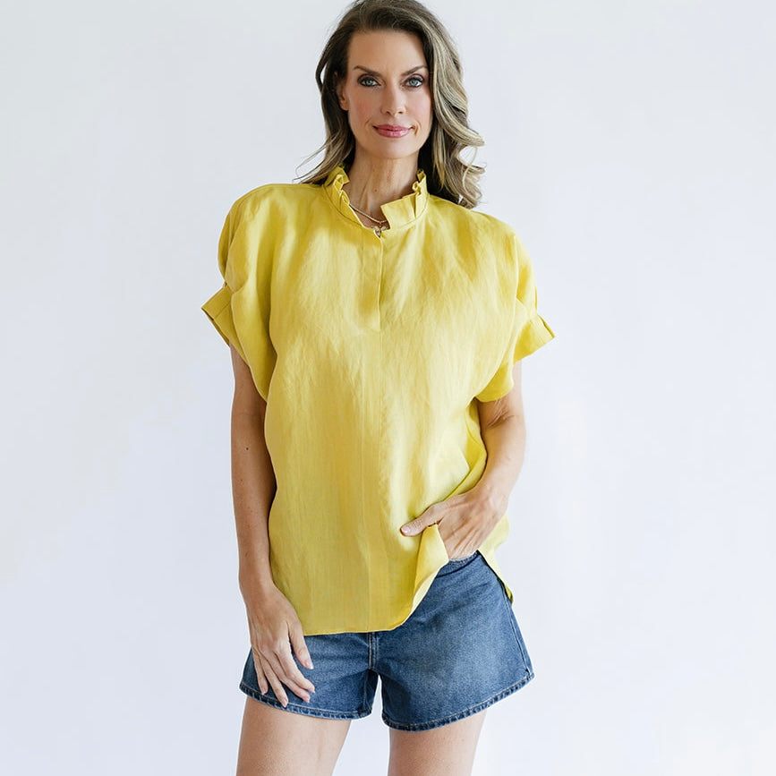 the RENEA is a fan favorite! Her "not too fussy" ruffle details at the neck and cuff offer a subtle feminine detail you will be sure to love. True to the JAG style, the RENEA is slightly oversized for comfort and flattering on all body types!